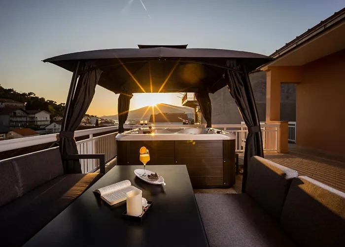 Offering a hot tub for a relaxing experience, Beautiful Holiday Home "Villa Relax Oasis" Trogir is located 15 minutes' walk from the Trogir City Hall. The 6-bedroom villa, situated within a few blocks of Church of St. Barbara, invites guests to enjoy views of the sea from a patio with a dining table.